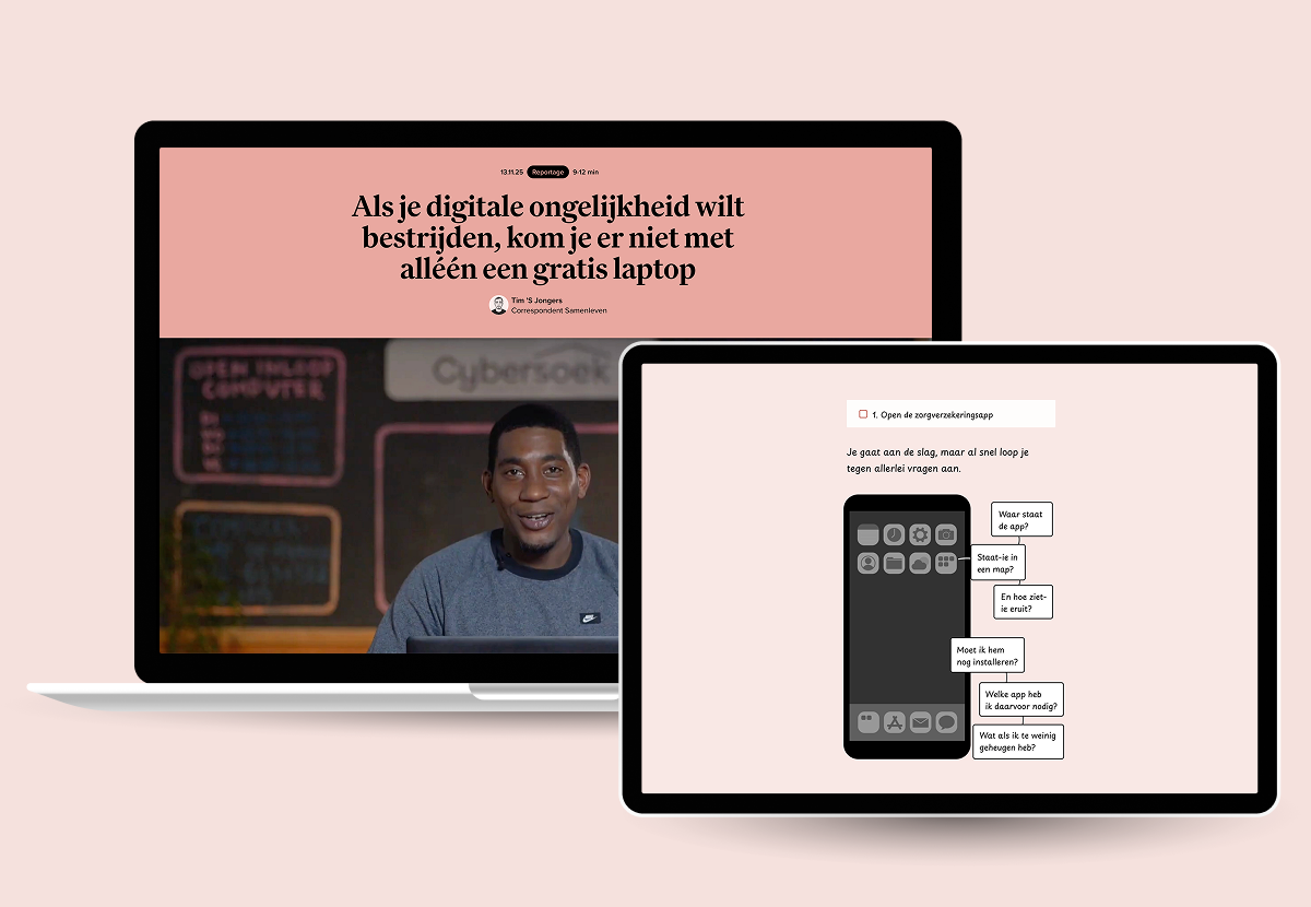 An illustrative example is an article on digital illiteracy. Written by Tim ’s Jongers, the story reports on Cybersoek—an organisation where people who struggle with digital services can go to ask help from volunteers. Their questions range from using social media to applying for social housing to handling banking tasks that are too complex to manage on their own.