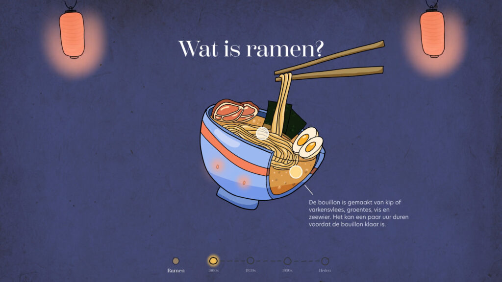 This is a prototype of a webpage that guides users through the history of ramen across a series of chapters. Each chapter is centered around a structure or building that played a key role in the evolution of ramen. Interactive points are embedded within these structures, offering additional details and insights. In addition, sound design has been added to make the experience more immersive.